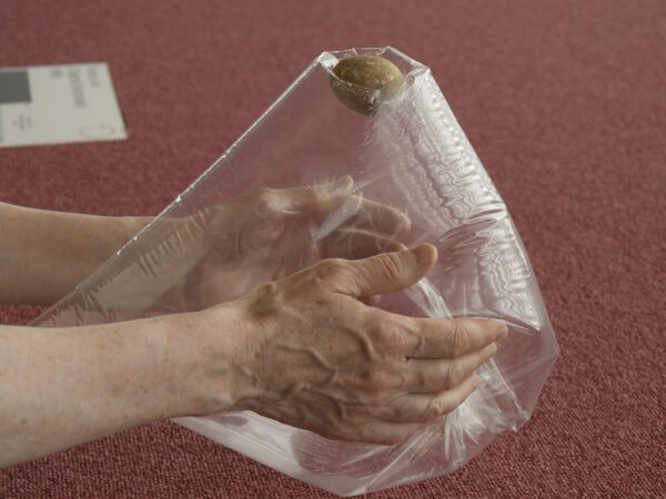 Siirrän pienen kiven näyttelyoppaan avustuksella oikeaan paikkaan, jotta voin puristaa muovipussia niin, että kivi alkaa liikkua kämmenieni voimasta ylös ja alas. Jotta saan kiven pysymään pussin uumenissa, joudun keskittymään. Ehkä keskittyminen onkin sitä, johon tämän päivän ihmisenä tarvitsen harjoitusta? Kokemukseni lähes 60 vuotta sitten esitetystä ehdotuksesta on minulle erityinen, ja samaan aikaan liityn muiden näyttelijäkävijöiden joukkoon, jotka ennen ja jälkeen minun taiteilevat ilman, muovipussin ja kiven kanssa. Leikki, joka muotoutuu jatkuvasti uudelleen.