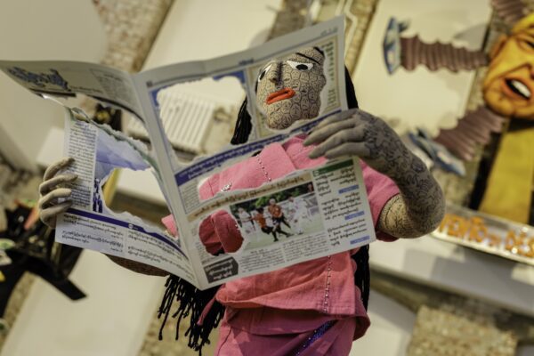 Sophiensaelessa oli esillä vain muutama teos, mutta ne kommunikoivat toistensa kanssa hyvin ja nivoutuvat jollain tavoin esitystaiteeseen. Näyttelyn teeman ja taiteellisten strategioiden kannalta Major Nomin teos The Beggar’s Convention (2024) oli yksi biennaalin avainteoksista. Nomin videoteos perustuu burmalaisen koomikon Zarganarin teatterikomediaan. Nom on sovittanut näytelmän uudestaan videomuotoon, jossa joukko kerjäläisiä on kokoontunut yhteen pohtiessa kerjäämistä koskevia haasteita ja jakamaan hyviä käytäntöjä. Kerjäläinen voisi hyvin rinnastua taiteelliseen työhön, johon liittyy jatkuvasti toimeentuloon ja toiminnan edellytyksiin liittyviä haasteita. Toki teos on myös Myanmarin hallinnon kritiikki, jonka kohteena on kenraali Ne Wi’n sosialistisen puoleen ajama politiikka ja epäonnistuminen esimerkiksi koulutuspolitiikan suhteen.