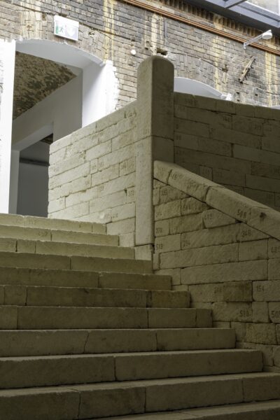 Astuessa KW:n suurimman näyttelytilan aulaan heräsi ensin kysymys, miten tilassa voi liikkua. Tämä johtui Margherita Moscardinin paikkasidonnaisesta The Stairway (2025) teoksesta, nimensä mukaisesti paikan päällä kootuista kivirappusista. Moscardinin teos koostuu 561 kivestä, joihin hän on kaivertanut myös numeron, joka ilmentää yksittäisen kiven ”laillista asemaa”. Hän lahjoitti kivet ensin erilaisille organisaatioille, yliopistoille, alkuperäiskansojen yhteisöille ja autonomisille toimijoille, ja pyysi sitten lahjoittamaan kivet takaisin.