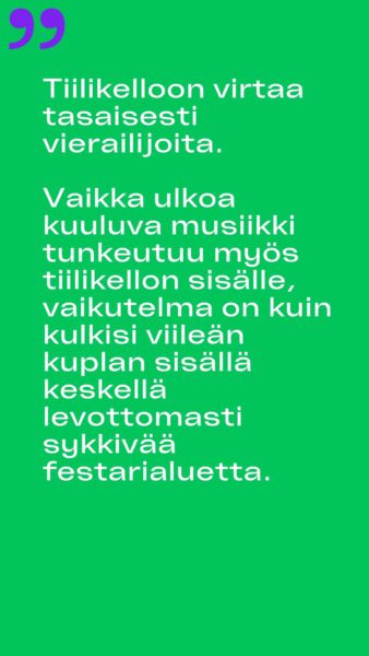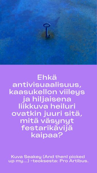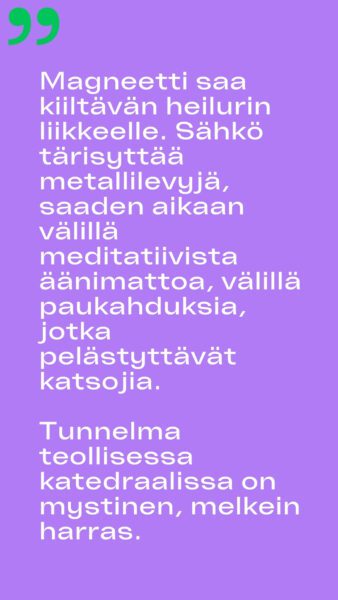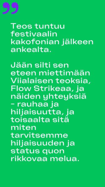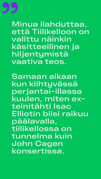 “Minua ilahduttaa, että Tiilikelloon on valittu näinkin käsitteellinen ja hiljentymistä vaativa teos. Samaan aikaan kun kiihtyvässä perjantai-illassa kuulen, miten ex-teinitähti Isac Elliotin biisi raikuu päälavalla, tiilikellossa on tunnelma kuin John Cagen konsertissa.”