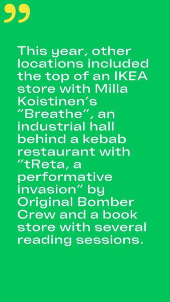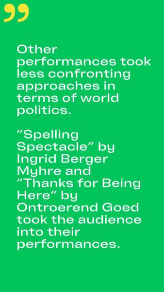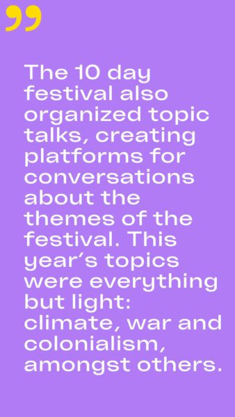 ”The 10 day festival also organized topic talks, creating platforms for conversations about the themes of the festival. This year’s topics were everything but light: climate, war and colonialism, amongst others.”