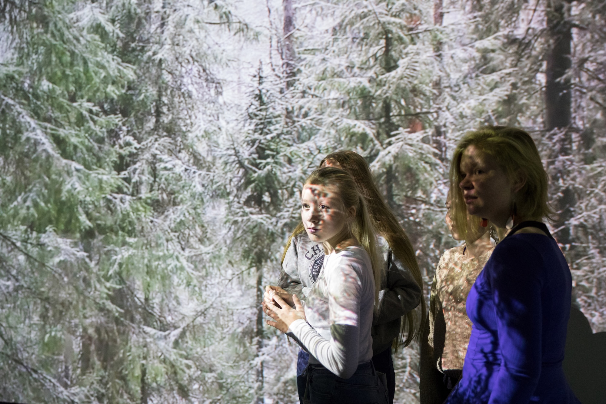 Kuvassa kahdeksasluokkalaisia taidetestaajia tutustumassa Oulun taidemuseoon ja taiteilija Anni Rapinojan Luonnollisesti-näyttelyyn. Kuvaaja: Sanna Krook.