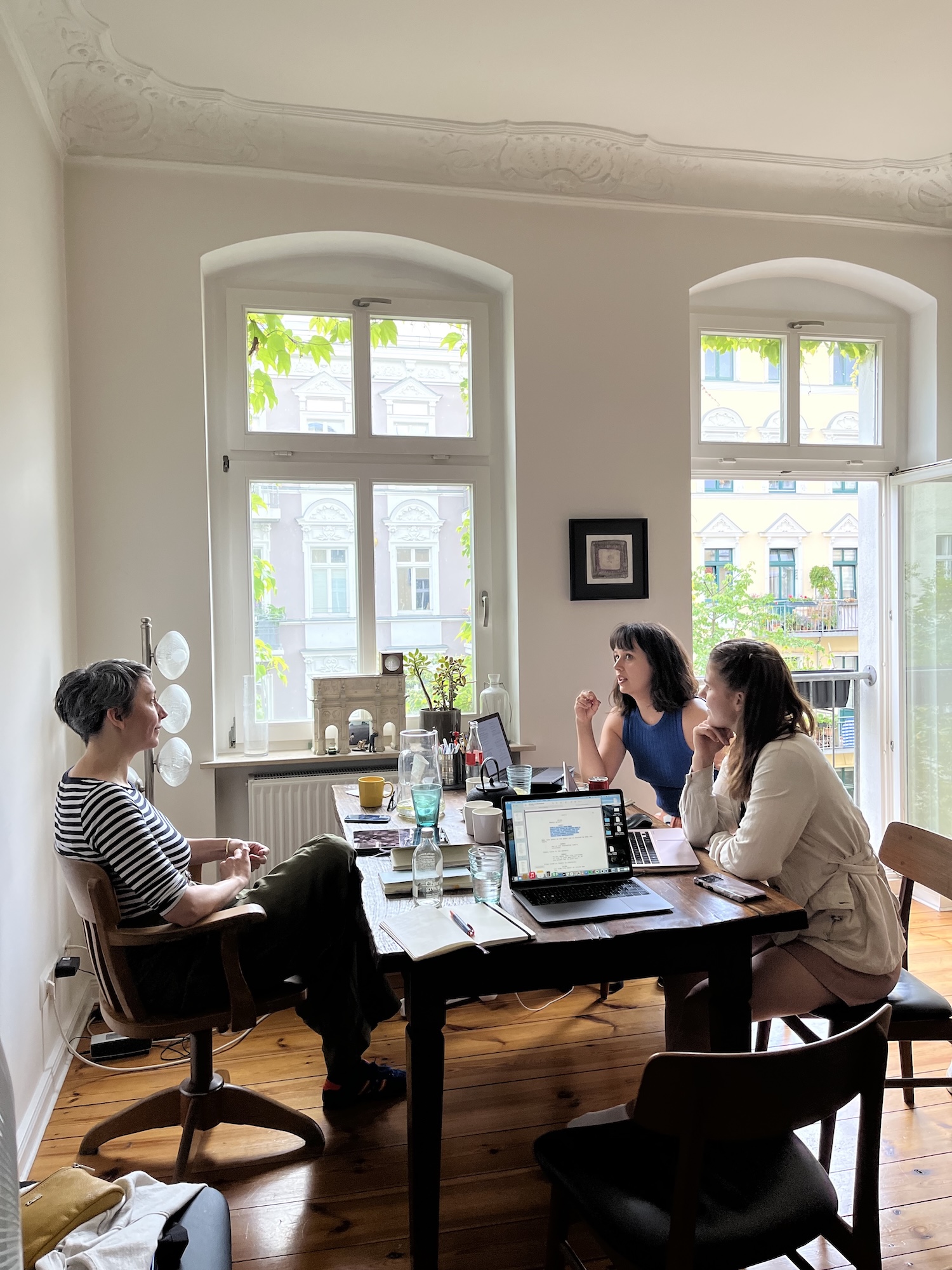 Kuvassa Francoise von Roy, Siiri Halko ja Petra Koivula puhuvat käsikirjoituksesta. Kuvaaja Jenni Jauri.